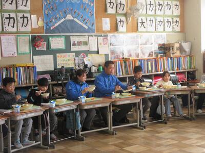 お話の後は、一緒に給食をいただきました。質問を続けながら楽しく食事をし、いつも以上に給食を頑張って食べる姿が見られました。