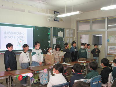 1組は「えがおのひみつたんけんたい」、2組は「つくってためして」の学習について、自分たちでまとめて工夫して発表をしました。